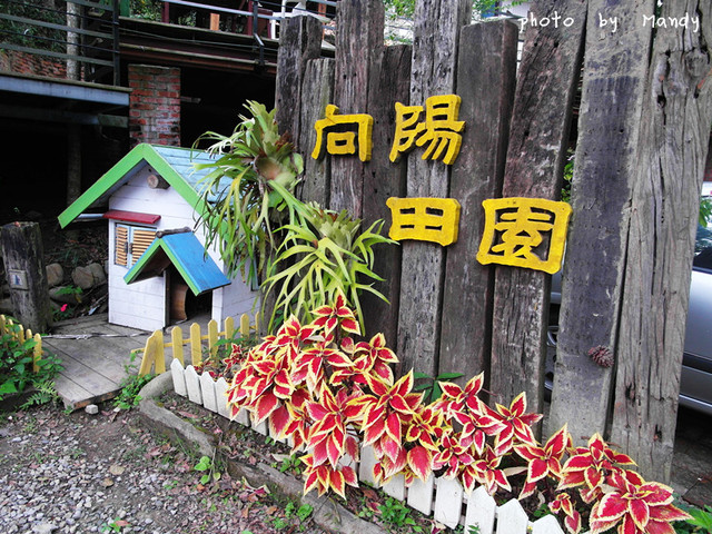 柵欄旁邊有著大大的"向陽田園"字樣,左邊有一間狗屋,裡面的狗狗很乖很會撒嬌,討人喜歡。