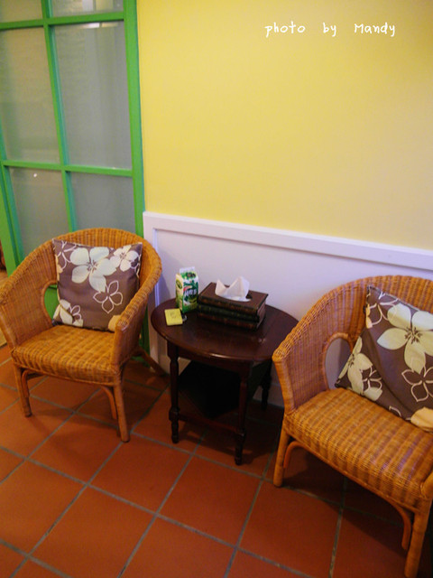 黃綠色調,加上一旁的籐椅,整體有鄉村的風格
