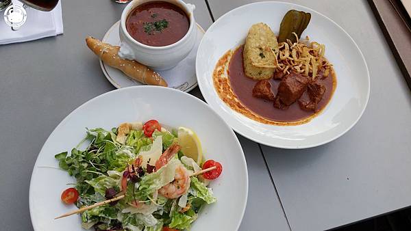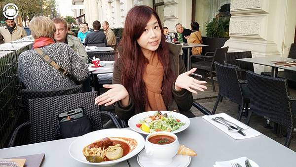 ▼我們點了一桌子豐盛的菜,有主餐、湯、甜點、飲料~邊享用美食邊看著一旁熙來攘往的異國街道,真的很有氣氛呢!不敢相信我們就在婚禮隔天就衝來東歐自助蜜月,現在想起來都會覺得甜甜的!