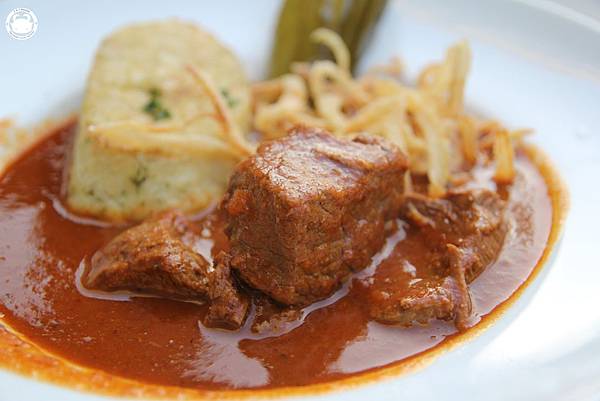 牛肉燉的軟爛,柔軟好嚼,搭配醬汁鹹度適中蠻入味的,一旁浸在醬汁裡的是麵包,也濕潤可口,我愛這麵包沾附醬汁的口感!